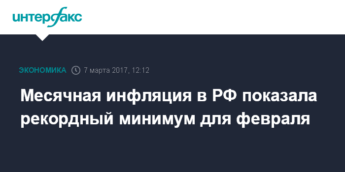 За январь-февраль 2017 года цены выросли на 0,8%. Столь низкой инфляция в феврале (месяце, когда наблюдается сезонный рост на плодоовощную продукцию) не была за все время наблюдения с 1991 года - до этого минимальный показатель был зафиксирован в феврале 2012 года - 0,4%.