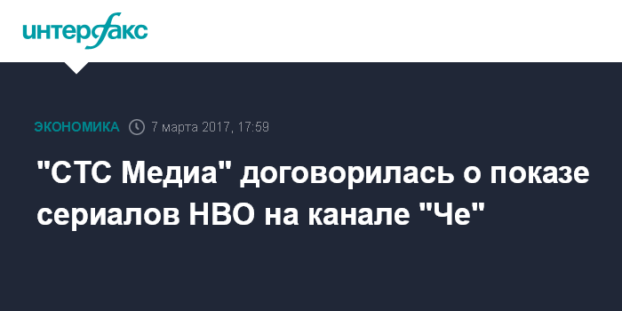 Москва. 7 марта. INTERFAX.RU - "СТС Медиа" объявила о заключении контракта с американской HBO, в соответствии с которым канал "Че" получает исключительные права на показ ряда сериалов HBO в российском телеэфире, сообщается в пресс-релизе холдинга.
