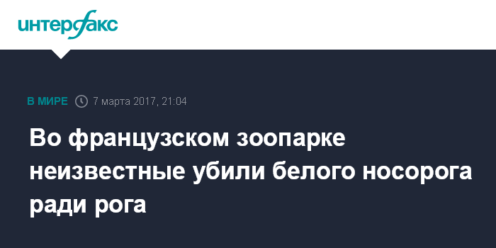 Москва. 7 марта. INTERFAX.RU - В зоопарке французского города Туари неизвестные проникли в вольер с африканскими носорогами и убили одного из них, сообщила во вторник BBC.