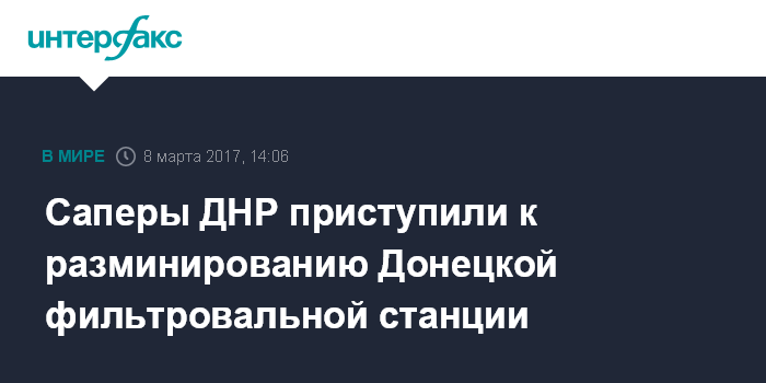 Москва. 8 марта. INTERFAX.RU - Специальная мониторинговая миссия ОБСЕ и Совместный центр по контролю и координации режима прекращения огня (СЦКК) получили подтверждения от украинской стороны для начала разминирования территории Донецкой фильтровальной станции (ДФС).