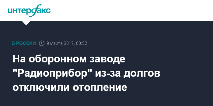 Москва. 9 марта. INTERFAX.RU - В трех корпусах оборонного завода "Радиоприбор" во Владивостоке отключили подачу теплоэнергии из-за долгов, общая сумма которых превысила 24 млн руб, говорится в сообщении генерирующей компании.