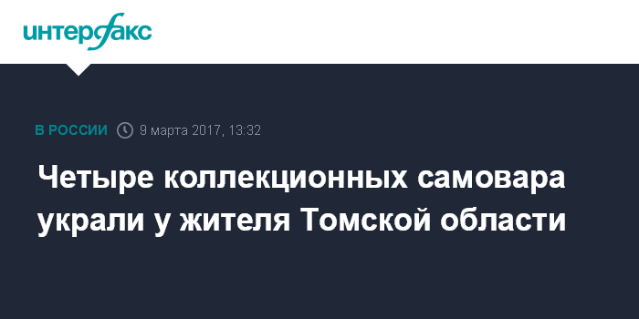 Москва. 9 марта. INTERFAX.RU - Томские полицейские задержали 32-летнего мужчину, который украл коллекционные самовары у своего знакомого, сообщает пресс-служба УМВД по региону в четверг.
