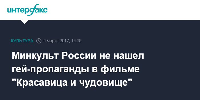 Москва. 9 марта. INTERFAX.RU - Глава Министерства культуры Владимир Мединский заявил, что признаков гей-пропаганды в фильме "Красавица и чудовище" не найдено.