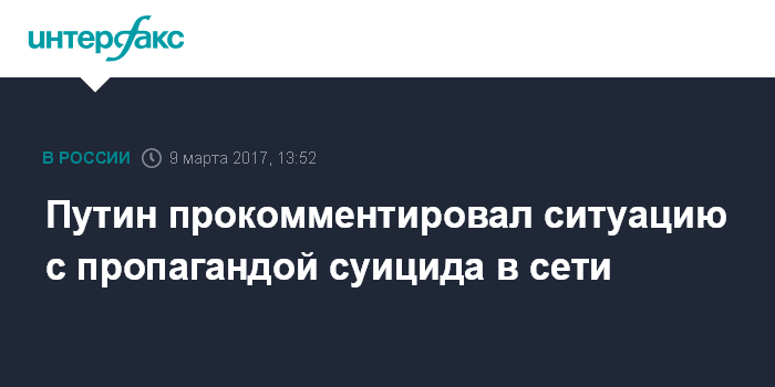 "В информационной сфере появилась еще одна угроза, о которой я бы хотел сказать отдельно. Это распространение сайтов, пропагандирующих суицид. Преступники - а иначе их не назовешь, можно было бы назвать, если бы не публичное выступление - прежде всего, нацелены на подростковую и молодежную аудиторию, на детей с неокрепшей психикой, находящихся в трудной жизненной ситуации", - сказал глава государства, выступая на расширенной коллегии МВД РФ в четверг.