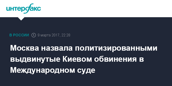 Москва. 9 марта. INTERFAX.RU - МИД РФ обвинил Киев в использовании Международного суда для выдвижения политизированных обвинений в адрес России.