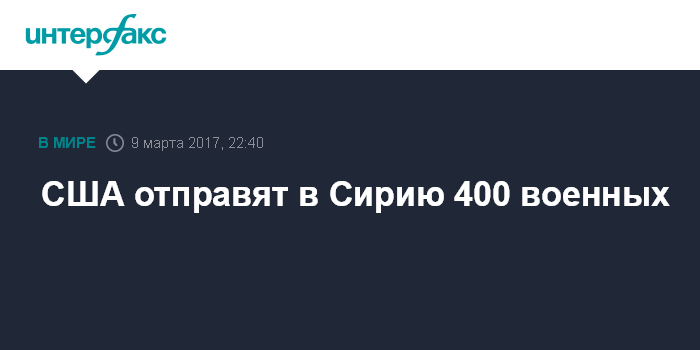 Москва. 9 марта. INTERFAX.RU - Дополнительно 400 американских военных направляются в Сирию, где будут оказывать поддержку при штурме города Ракки, сообщил в четверг представитель международной коалиции Джон Дориан.