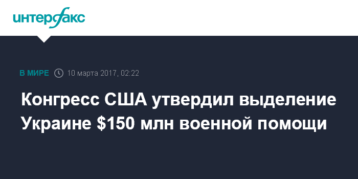 Москва. 10 марта. INTERFAX.RU - Палата представителей Конгресса США одобрила выделение Украине военной помощи в размере $150 млн, сообщает народный депутат Украины Ирина Фриз.
