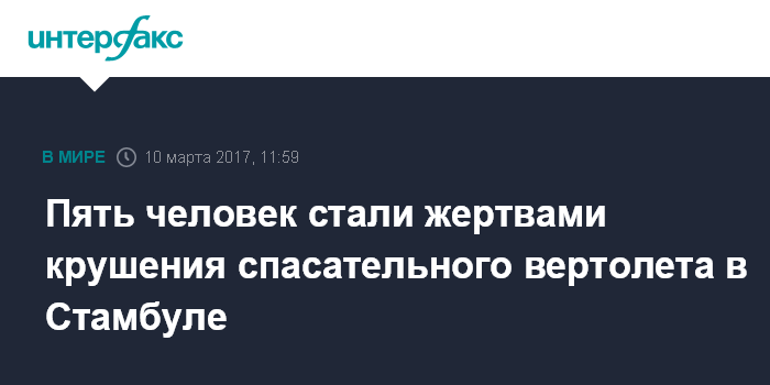 Москва. 10 марта. INTERFAX.RU - По меньшей мере пять человек погибли в результате крушения вертолета спасательных служб в Стамбуле, сообщают в пятницу турецкие СМИ со ссылкой на местные власти.