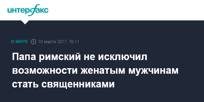 Москва. 10 марта. INTERFAX.RU - Папа римский Франциск заявил, что не отвергает вероятности того, что церковь позволит женатым мужчинам становиться священниками.