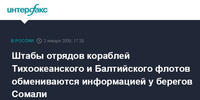 Москва. 2 января. INTERFAX.RU - В пятницу в районе южнее острова Сокотра (у берегов Сомали) состоялась встреча отряда боевых кораблей Тихоокеанского флота с отрядом боевых кораблей Балтийского флота, сообщил журналистам помощник Главкома ВМФ капитан 1 ранга Игорь Дыгало.