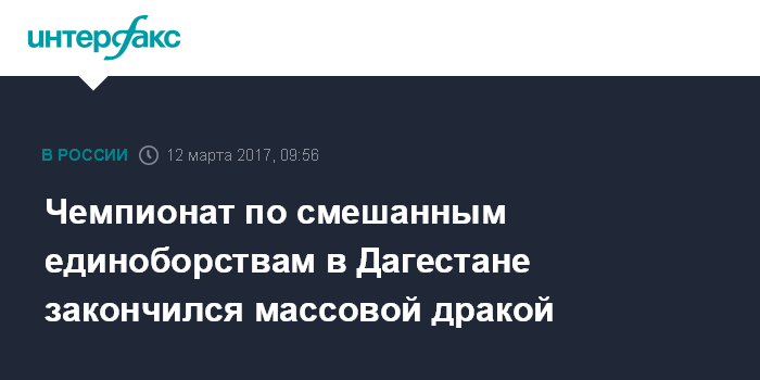 Москва. 12 марта. INTERFAX.RU - Во время чемпионата по смешанным единоборствам в Дагестане произошла массовая драка. Об инциденте сообщается на странице "ВКонтакте" дагестанского клуба ММА "Горец". Видеозапись произошедшего также была выложена на YouTube.
