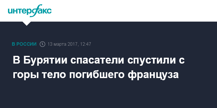 Москва. 13 марта. INTERFAX.RU - Завершена операция по транспортировке тела гражданина Франции, погибшего под лавиной на горе Мамай в Бурятии, сообщили агентству "Интерфакс" в пресс-службе главного республиканского управления МЧС. "Спасательная операция завершена, тело туриста передано сотрудникам полиции", - сказали в пресс-службе.