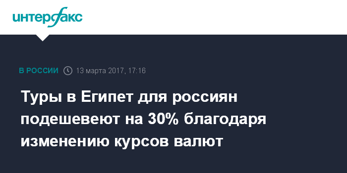 Москва. 13 марта. INTERFAX.RU - После открытия авиасообщения туры в Египет могут значительно подешеветь для россиян благодаря изменению курсов валют, сообщает Ассоциация туроператоров России (АТОР) со ссылкой на председателя управления по развитию туризма Египта Хишама-эль-Демери.