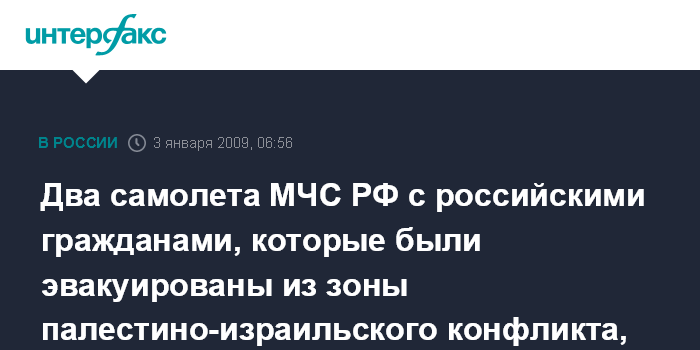 Москва. 3 января. ИНТЕРФАКС - Самолеты МЧС РФ с эвакуированными из зоны палестино-израильского конфликта российскими гражданами прибыли в московский аэропорт "Домодедово".