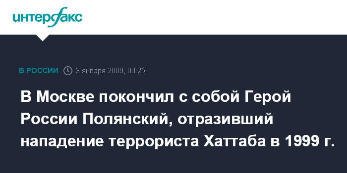 Москва. 3 января. ИНТЕРФАКС-МОСКВА - В Москве в своей квартире покончил жизнь самоубийством полковник ВДВ, Герой России Валентин Полянский.