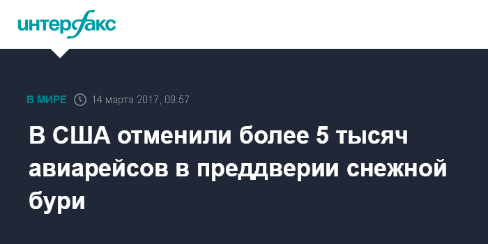 Москва. 14 марта. INTERFAX.RU - В аэропортах на северо-востоке США отменены более 5 тысяч рейсов из-за надвигающейся снежной бури, сообщил во вторник американский телеканал Fox News. Железнодорожные компании и метрополитен Нью-Йорка также сообщили о частичном закрытии путей сообщения.