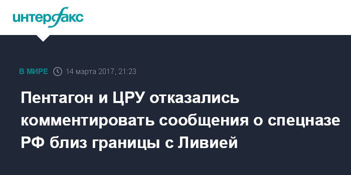 Москва. 14 марта. INTERFAX.RU - В министерстве обороны и ЦРУ США отказались комментировать сообщения о том, что на территории Египта недалеко от ливийской границы якобы расположен российский спецназ.