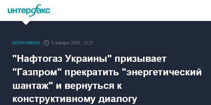 Москва. 3 января. INTERFAX.RU - НАК "Нафтогаз Украины" заявляет об "энергетическом шантаже" со стороны ОАО "Газпром", его неспособности вести переговоры, что привело к остановке газоснабжения Украины и разбалансированию механизма газового транзита в Европу.