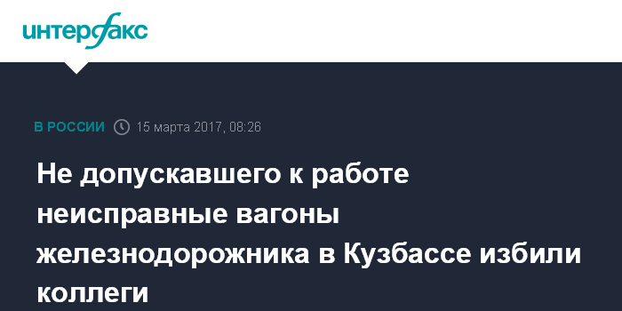 Москва. 15 марта. INTERFAX.RU - Осмотрщика железнодорожных вагонов вагоноремонтной компании города Топки Кемеровской области избили его коллеги за отказ допускать к работе неисправные вагоны, сообщили в среду агентству "Интерфакс" в пресс-службе линейного управления МВД на транспорте по СФО.