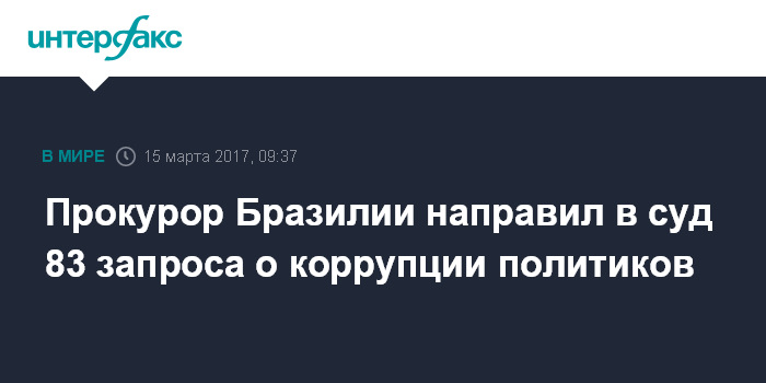 Москва. 15 марта. INTERFAX.RU - Генеральный прокурор Бразилии Родригу Жано направил в Верховный суд страны 83 запроса о начале уголовного расследования случаев коррупции бразильских чиновников и политиков.