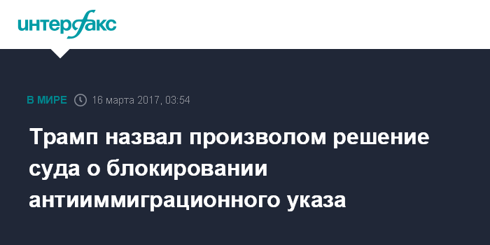 Москва. 16 марта. INTERFAX.RU - Президент США Дональд Трамп назвал решение федерального судьи в штате Гавайи заблокировать новый указ по иммиграции "беспрецедентным судебным произволом".