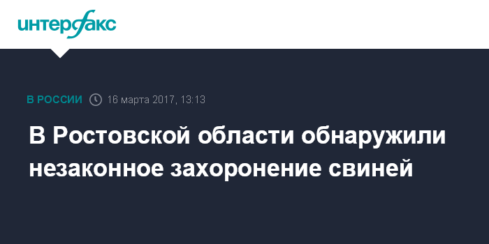 Москва. 16 марта. INTERFAX.RU - Комиссия по чрезвычайным ситуациям работает в районе поселка Ключевой в Ростовской области, где найдено незаконное захоронение семи свиней, сообщили агентству "Интерфакс" в четверг в пресс-службе региональной станции по борьбе с болезнями животных.