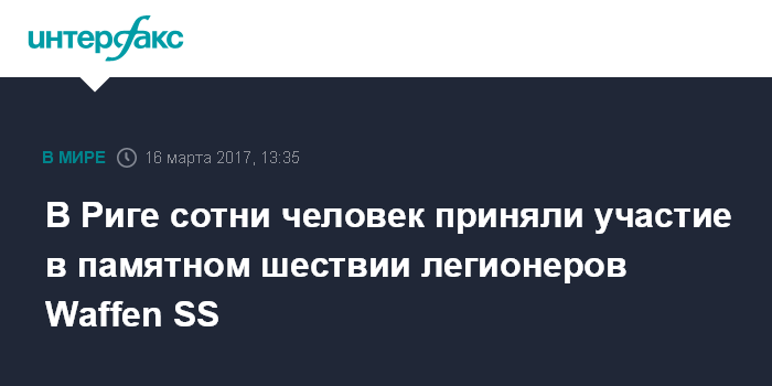Москва. 16 марта. INTERFAX.RU - Несколько сотен человек идут маршем по улицам Риги в память о латышских легионерах Waffen SS, передает в четверг агентство BNS.