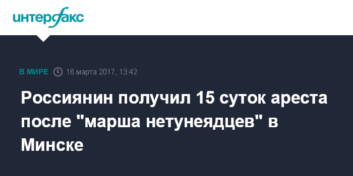 Москва. 16 марта. INTERFAX.RU - После санкционированного властями "марша нетунеядцев", который прошел 15 марта в Минске, был задержан россиянин, он получил 15 суток административного ареста.