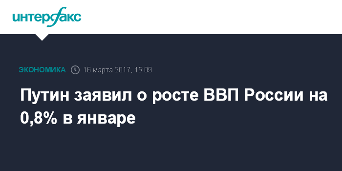 Москва. 16 марта. INTERFAX.RU - Рост ВВП России в январе составил 0,8%, заявил президент Владимир Путин в ходе выступления на "Неделе российского бизнеса", организованной РСПП.