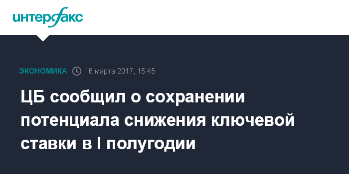 Москва. 16 марта. INTERFAX.RU - Потенциал снижения ключевой ставки ЦБ РФ в первом полугодии сохраняется, но он ограничен инфляционными рисками, говорится в комментарии Банка России по инфляции. Как сообщалось, по состоянию на 13 марта инфляция в годовом выражении замедлилась до 4,4%, таргет ЦБ на конец года - 4%.