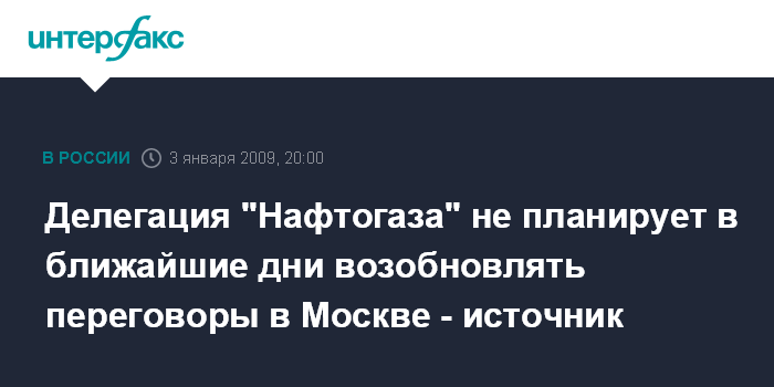 "Делегация НАК "Нафтогаз Украины" покинула "Газпром" 31 декабря по указанию президента Ющенко", - рассказал он. "На сегодняшний день указания возобновить переговоры не поступало", - сказал источник, отметив, что "в этой связи делегация пока не планирует вылетать в Москву на переговоры".