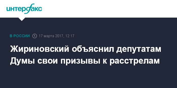 Москва. 17 марта. INTERFAX.RU - Лидер ЛДПР Владимир Жириновский заявил, что его слова о расстрелах и повешениях, брошенные в зал на прошлом заседании Госдумы, относятся не к депутатам, а к реальным преступникам, мафии.