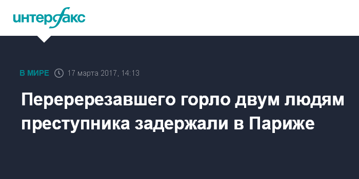 Москва. 17 марта. INTERFAX.RU - В Париже задержан мужчина, который ранее в пятницу перерезал горло двум людям, сообщает французская газета Le Figaro.