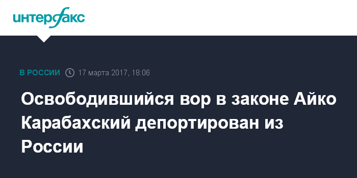 Москва. 17 марта. INTERFAX.RU - Криминальный авторитет, известный как Айко Карабахский, депортирован из России после отбытия срока наказания за незаконное приобретение наркотиков. Об этом сообщает в пятницу пресс-центр МВД РФ.
