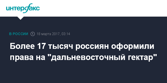 Москва. 18 марта. INTERFAX.RU - Более 17 тысяч россиян оформили свои права на "дальневосточный гектар" и поставили участок на кадастровый учет, еще около 8,5 тыс. получили договоры о безвозмездном срочном пользовании землей, сообщил в субботу заместитель руководителя Росреестра Андрей Приданкин.