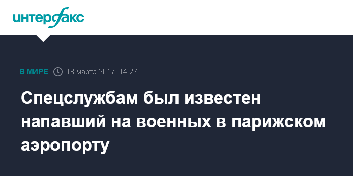 Москва. 18 марта. INTERFAX.RU - Мужчина, напавший на военных в парижском аэропорту "Орли", считался французскими спецслужбами "радикализированным" мусульманином, сообщают в субботу европейские СМИ.