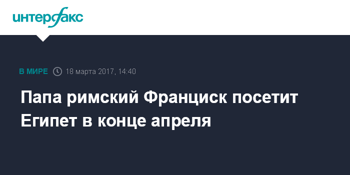 Москва. 18 марта. INTERFAX.RU - Папа римский Франциск планирует нанести двухдневный визит в Каир в конце апреля по приглашению президента Египта Абдельфаттаха ас-Сиси и верховного имама каирского университета "Аль-Азхар" Ахмеда ат-Тайеба, сообщают в субботу западные СМИ.