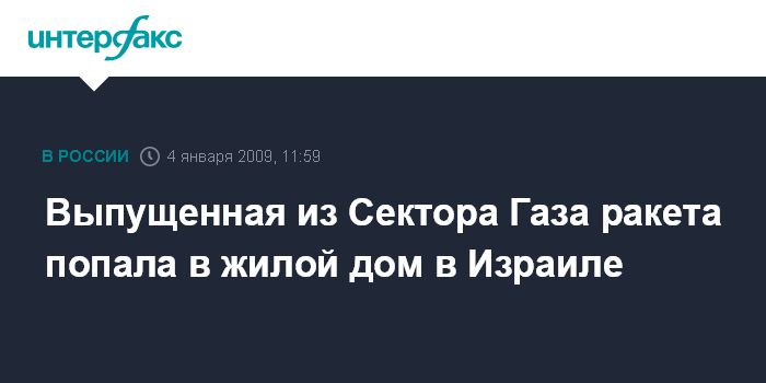 Москва. 4 января. INTERFAX.RU - Жилой дом в израильском Сдероте серьезно пострадал в результате попадания ракеты, выпущенной с территории сектора Газа.