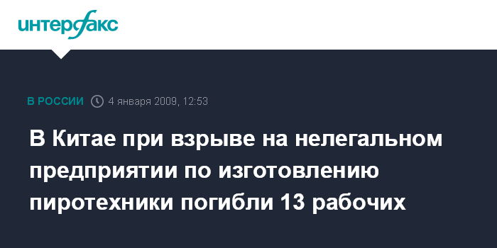 Москва. 4 января. INTERFAX.RU - На одном из нелегальных китайских заводов, выпускающих пиротехнику, в воскресенье произошел взрыв, унесший жизни 13 рабочих.