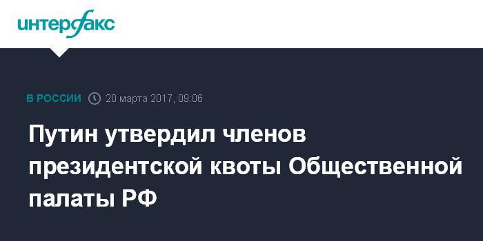 Москва. 20 марта. INTERFAX.RU - Президент РФ Владимир Путин своим указом утвердил членами Общественной палаты РФ 40 человек, составляющих президентскую квоту. Нынешнего секретаря ОП Александра Бречалова среди них нет.