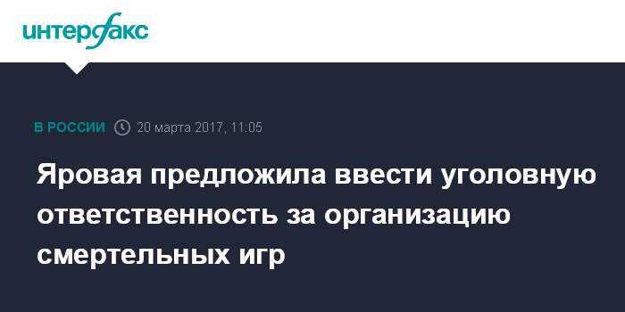Москва. 20 марта. INTERFAX.RU - Разработка смертельно опасных для детей игр типа "зацепинга" должна быть уголовно наказуема, заявила заместитель председателя Госдумы Ирина Яровая.