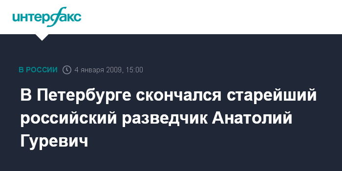 Москва. 4 января. INTERFAX.RU - Старейший российский разведчик Анатолий Гуревич скончался в Санкт-Петербурге на 96-м году жизни.