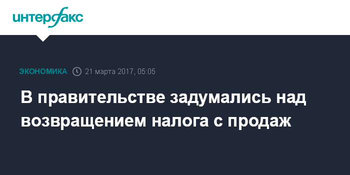Москва. 21 марта. INTERFAX.RU - Экономический блок правительства задумался над перспективой возвращения налога с продаж, пишут во вторник "Ведомости". Этот шаг может стать альтернативой повышению ставки НДС до 22%, которое ранее анонсировал министр финансов РФ Антон Силуанов.