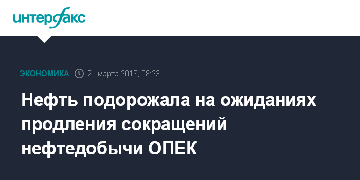 Москва. 21 марта. INTERFAX.RU - Нефть сдержанно дорожает в ходе торгов во вторник благодаря ожиданиям, что ОПЕК и не-ОПЕК согласуют продление ограничений нефтедобычи, чтобы поддержать рынок, а сильный мировой спрос будет способствовать сокращению товарных запасов и избыточного предложения топлива, сообщает CNBC.