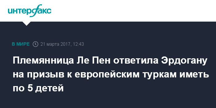 Москва. 21 марта. INTERFAX.RU - Депутат Национального Собрания Франции от партии "Национальный Фронт" Марион Ле Пен, тетя которой - Марин Ле Пен - является кандидатом на пост президента страны, ответила президенту Турции Реджепу Тайипу Эрдогану, который призвал проживающих в Европе турков заводить больше детей.