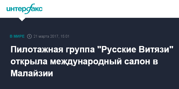 Москва. 21 марта. INTERFAX.RU - Экипажи авиационной группы высшего пилотажа "Русские Витязи" выполнили во вторник демонстрационные полеты на открытии международной выставки авиационно-космической и военно-морской техники "Лима-2017" в Малайзии, сообщили в Минобороны РФ.