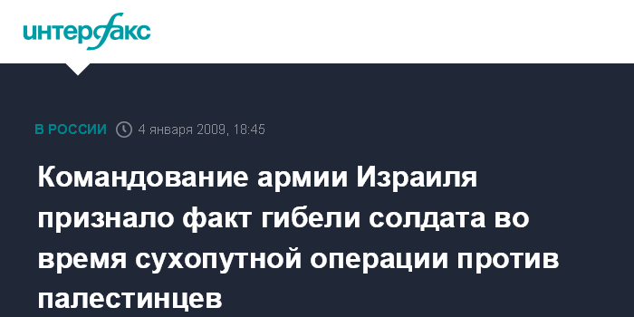 Москва. 4 января. INTERFAX.RU - Командование армии обороны Израиля (ЦАХАЛ) признало факт гибели одного солдата, участвовавшего в военных действиях против палестинцев в секторе Газа.