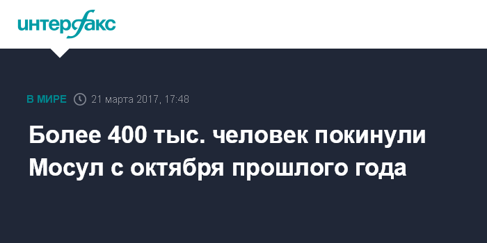 Москва. 21 марта. INTERFAX.RU - Более 400 тысяч человек бежали из Мосула после начала в октябре 2016 года операции по освобождению города от боевиков "Исламского государства" (террористическая организация, запрещенная в РФ), заявили в Совете по наблюдению за правами человека Ирака.