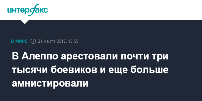 Москва. 21 марта. INTERFAX.RU - В сирийском Алеппо с 20 декабря 2016 года выявлено более 6 тысяч боевиков, из них 2923 арестованы и 3332 - амнистированы, заявил во вторник губернатор Алеппо Хусейн Дьяб.