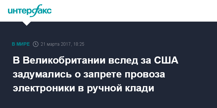 Москва. 21 марта. INTERFAX.RU - Власти Великобритании планируют ввести ограничения на провоз пассажирами электронных устройств в салонах самолетов, сообщает во вторник британская телерадиокорпорация "Би-Би-Си".